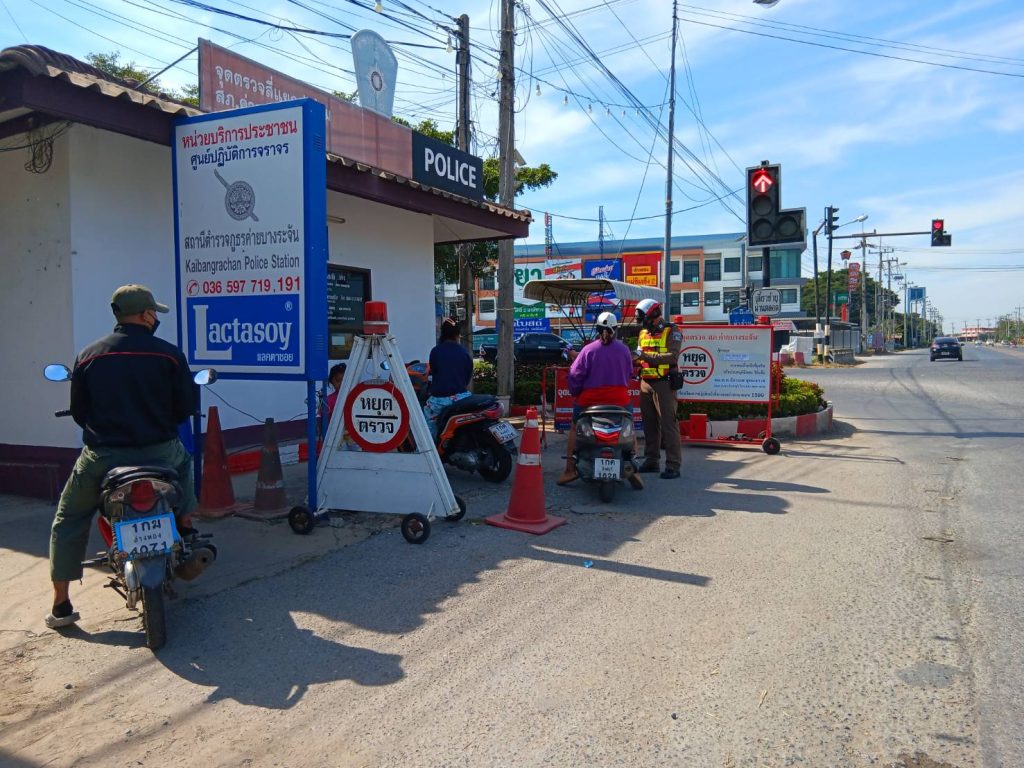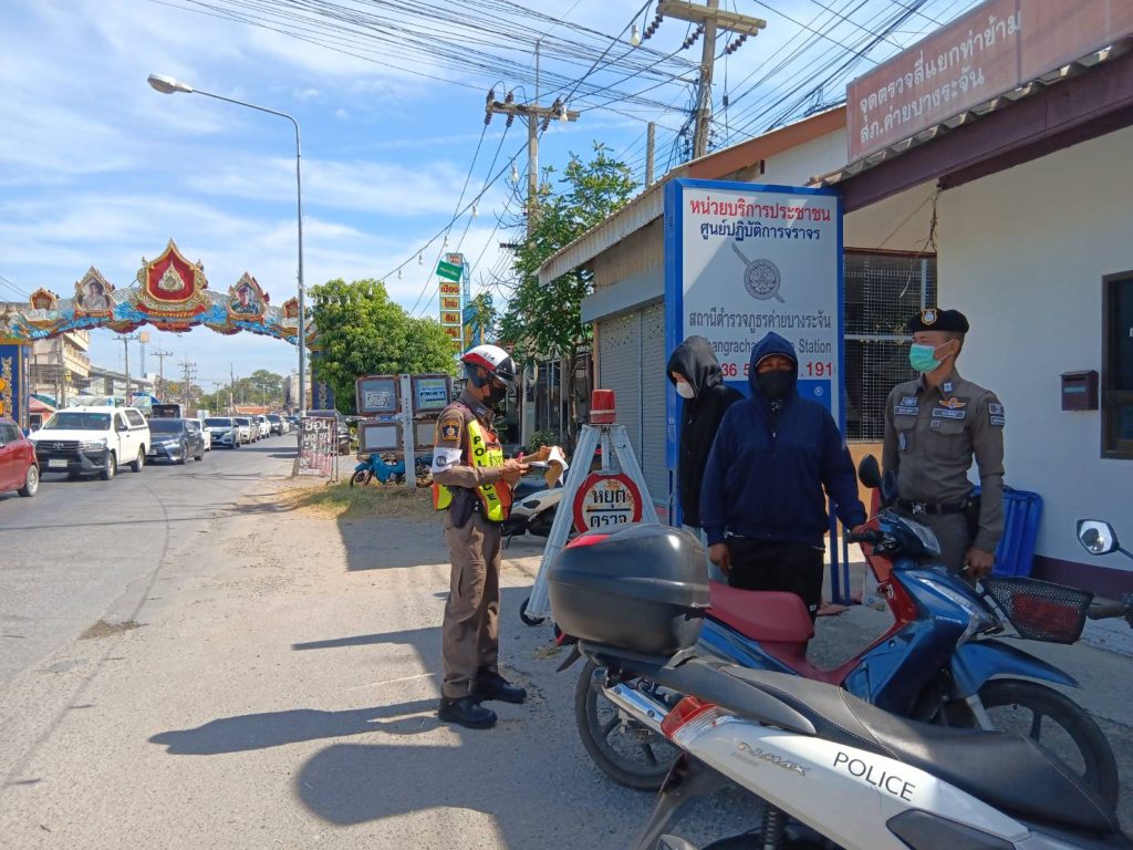 พ.ต.ท.สมหมาย สุขคง สวป.สภ.ค่ายบางระจัน หัวหน้าจุดตรวจ พร้อมกำลังสายตรวจจราจรกวดขันวินัยจราจร บริเวณสี่แยกท่าข้าม ถนนสิงห์บุรี-สุพรรณ อ.ค่ายบางระจัน จ.สิงห์บุรี