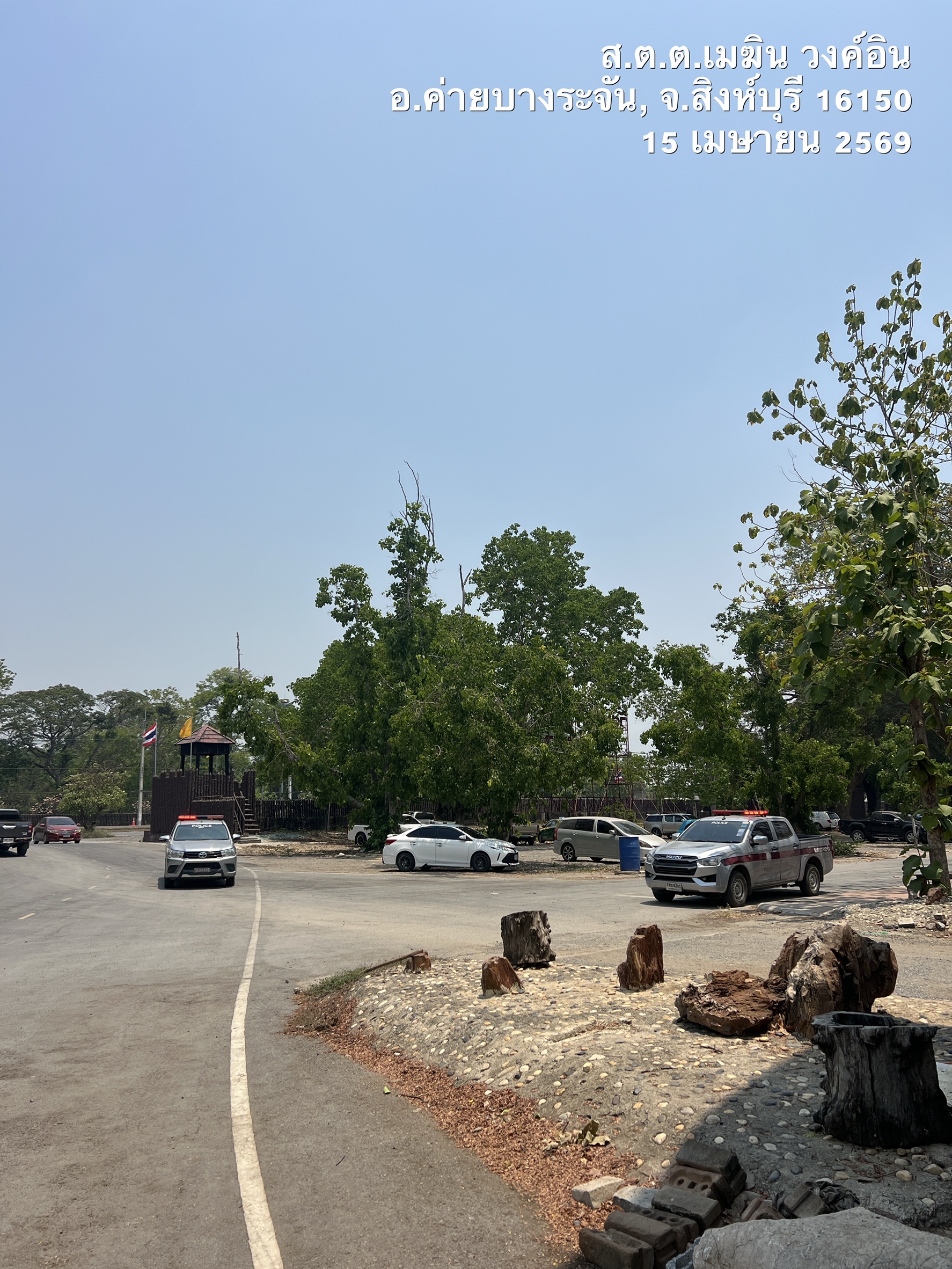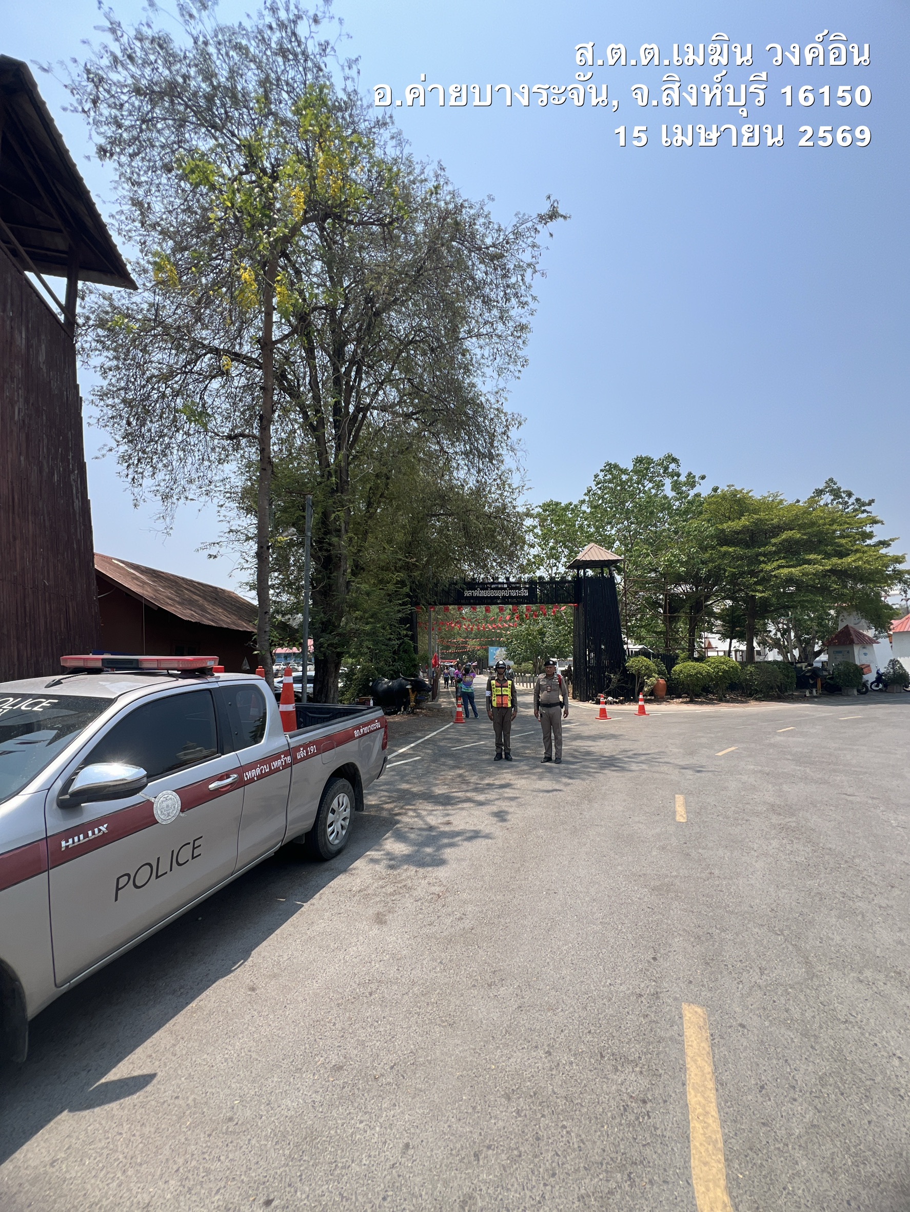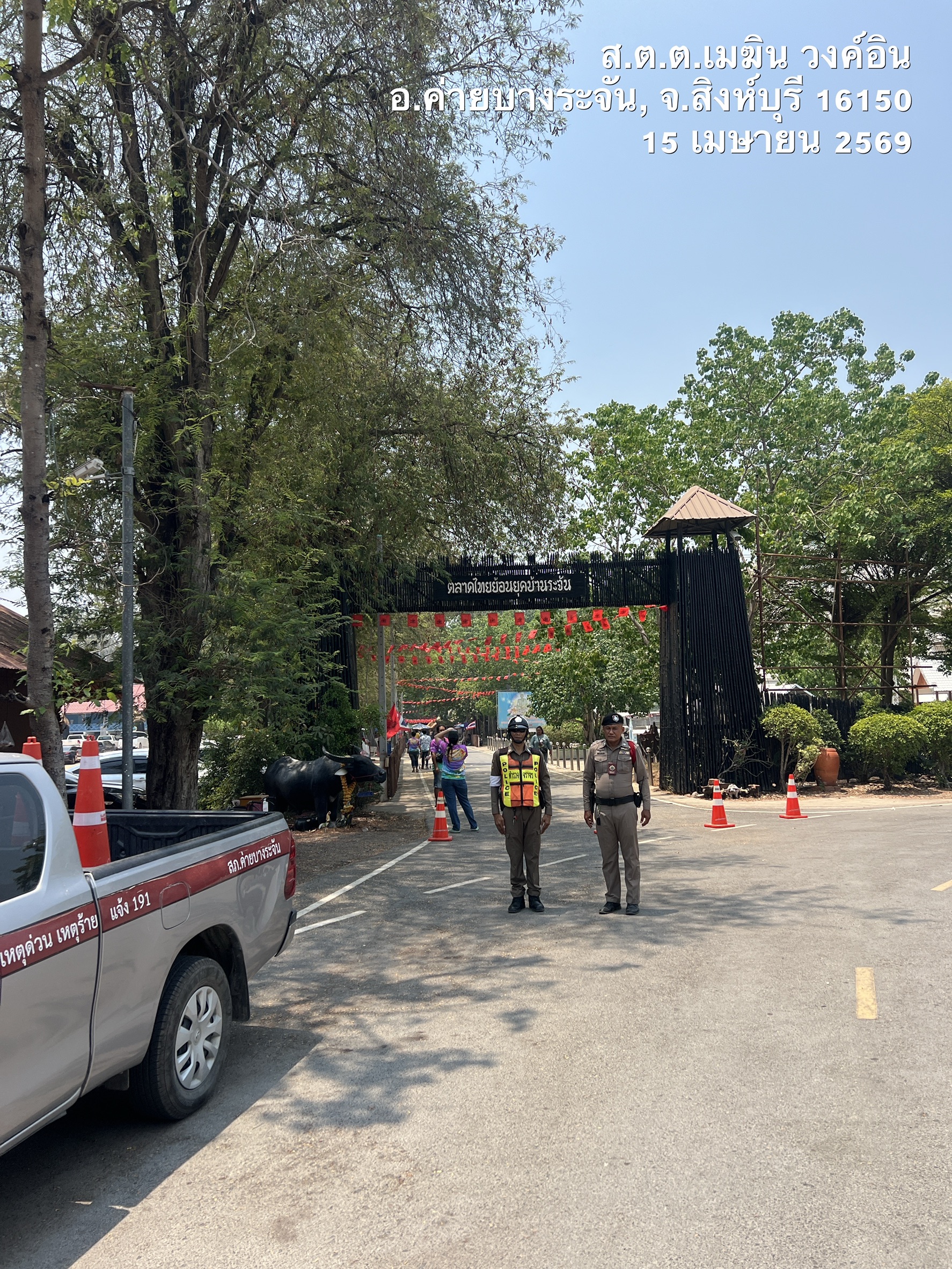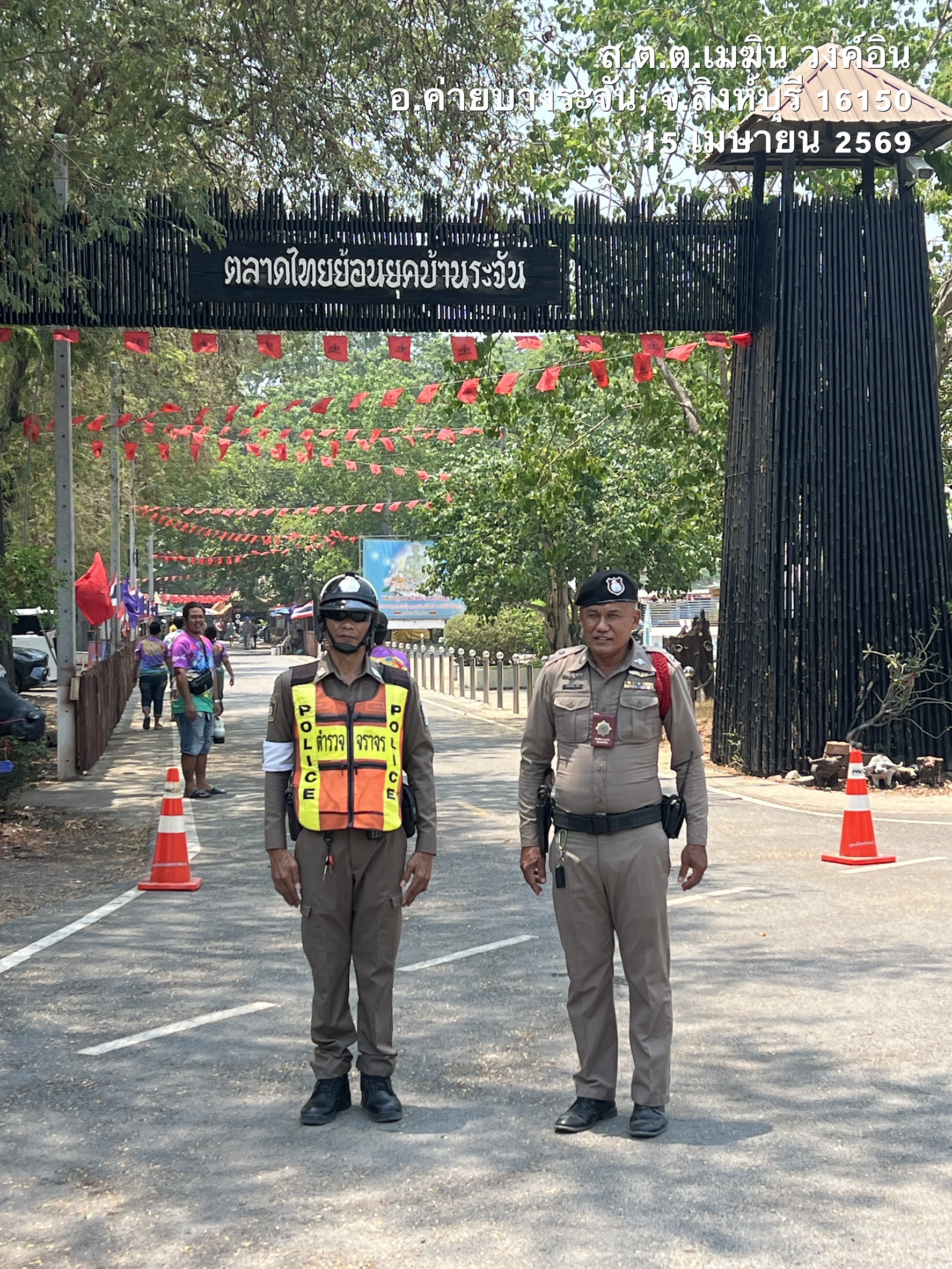 ร.ต.ท.สรรเพชญ มีชัย รอง สว (ป.)สภ.ค่ายบางระจัน คู่ตรวจ ส.ต.ต.เมฆิน วงค์อิน ผบ.หมู่(ป.)สภ.ค่ายบางระจัน พร้อม ด.ต.ปัญญา ปั้นเกตุ ผบ.หมู่(ป.)สภ.ค่ายบางระจัน ค่ายระจัน 20 และจราจร ว.4 ป้องกันเหตุ ตลาดไทยย้อนยุคบ้านระจัน